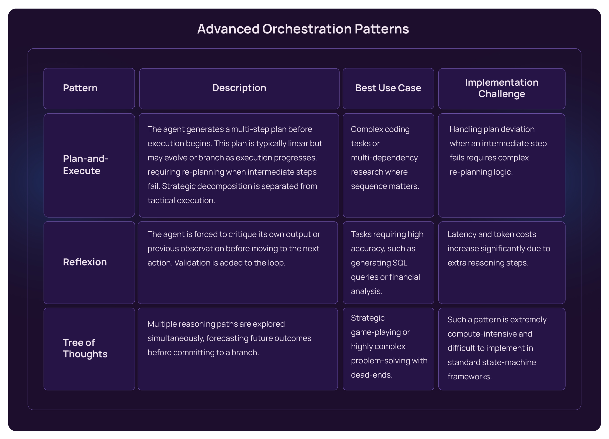 For complex, multi-step tasks, a simple reactive loop proves inefficient as the agent effectively feels its way through the dark. Advanced patterns separate planning from execution and introduce self-correction.