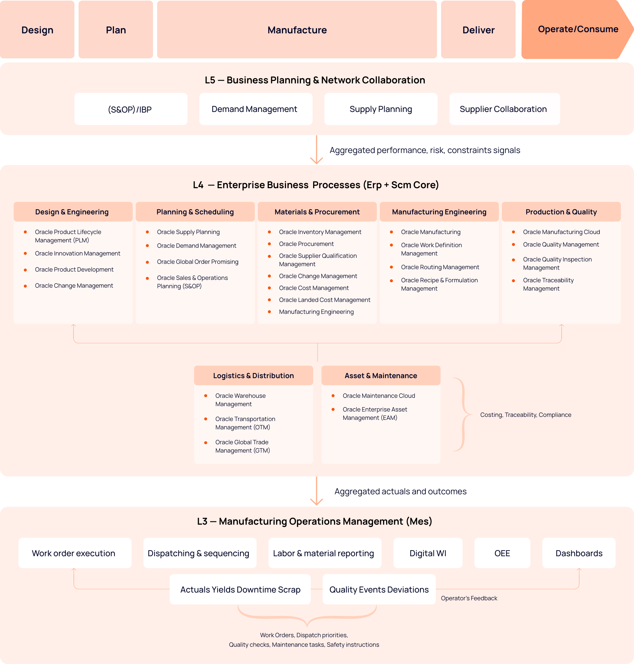Generic solutions fail in complex manufacturing. We tailor the Oracle digital core to your compliance, supply chain, and production needs across ETO and high-volume operations.