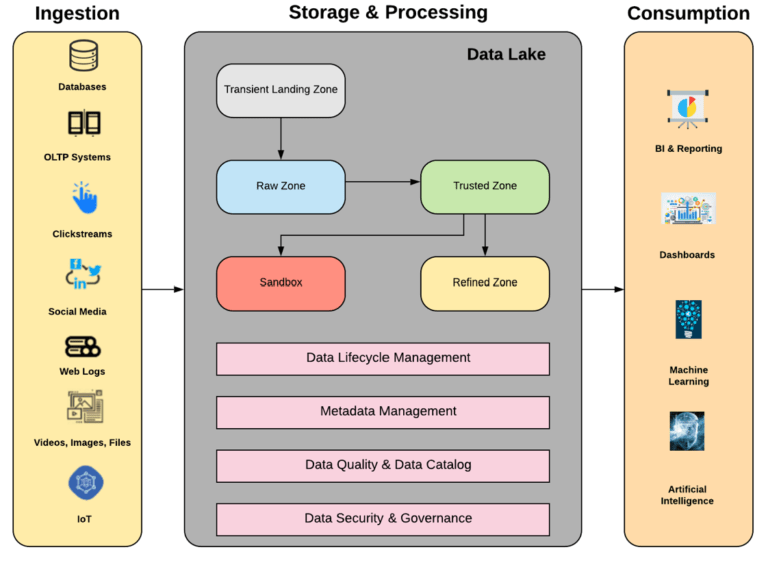 The three components in the Data Lake include: Ingestion, Storage & Processing and Consumption. It is difficult to come up with a one-size-fit-all architecture for a Data Lake. It depends on multiple factors related to the business problem the organizations ought to solve. Some considerations are given below: