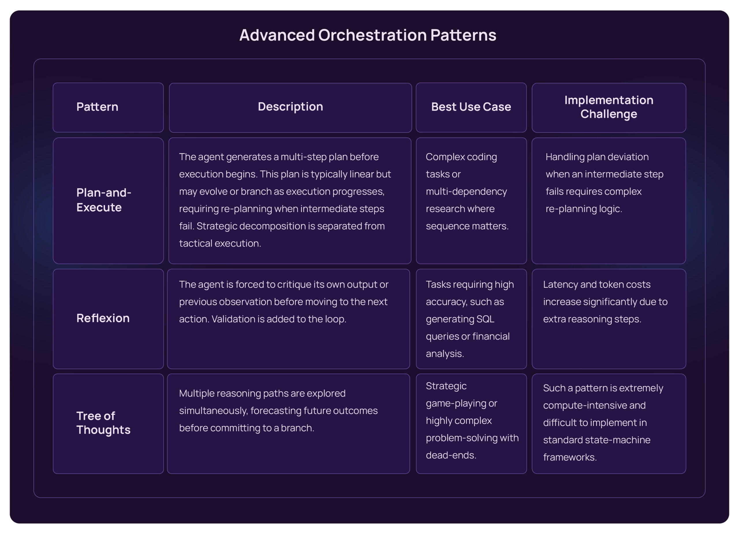 For complex, multi-step tasks, a simple reactive loop proves inefficient as the agent effectively feels its way through the dark. Advanced patterns separate planning from execution and introduce self-correction.